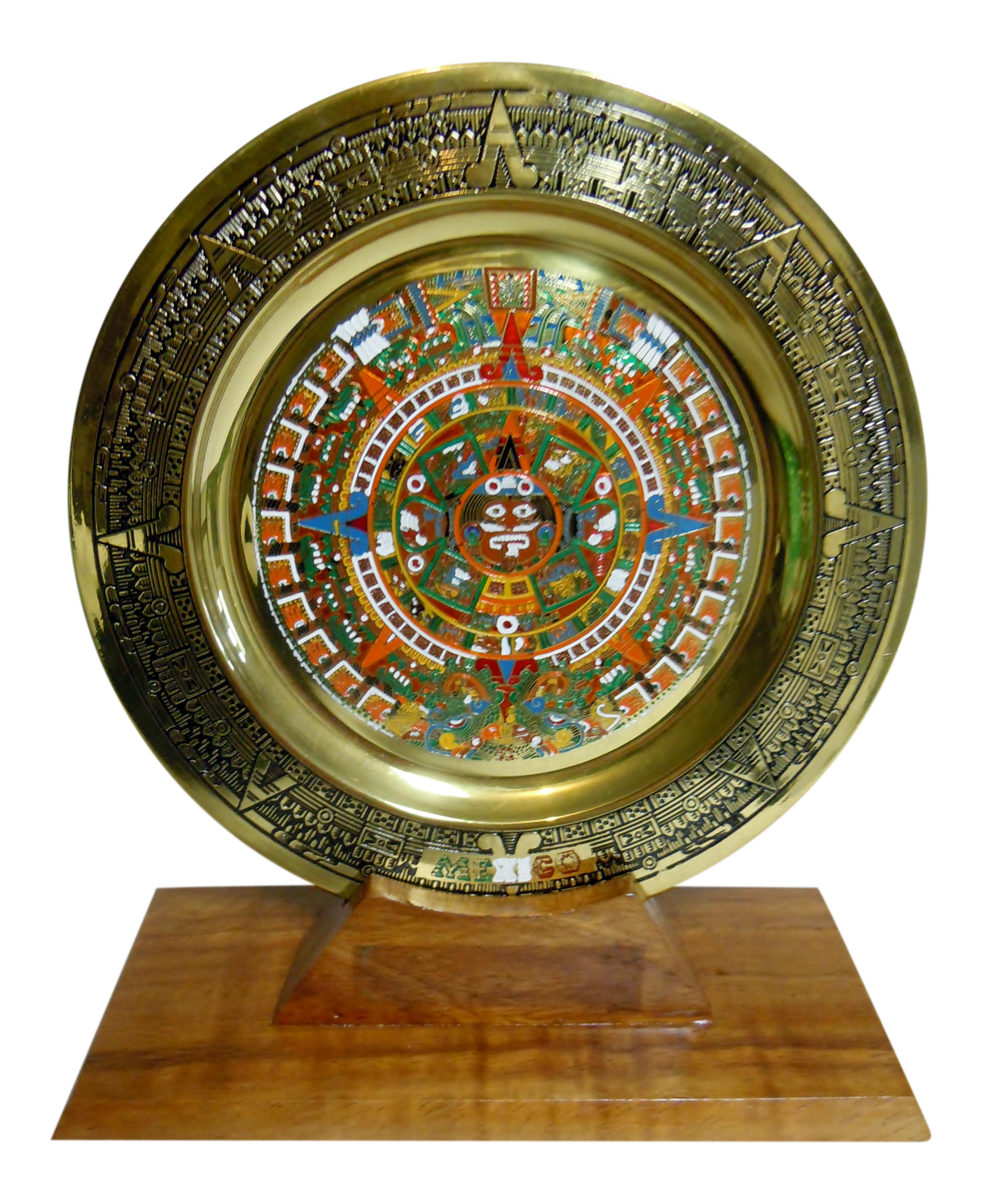 Aztec Calendar Enameled Metal Wall Plaque Plate On Wooden Stand Image information: